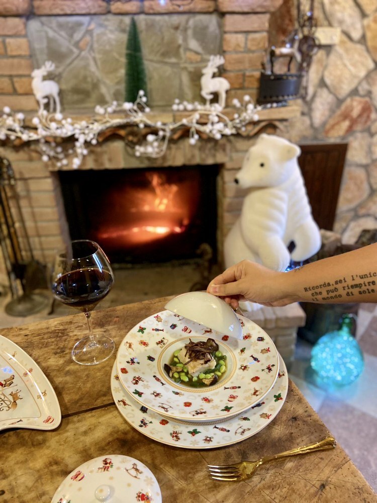 2. Persico brasato con edamame e fagiolini in brodo di funghi nella linea Xmas.