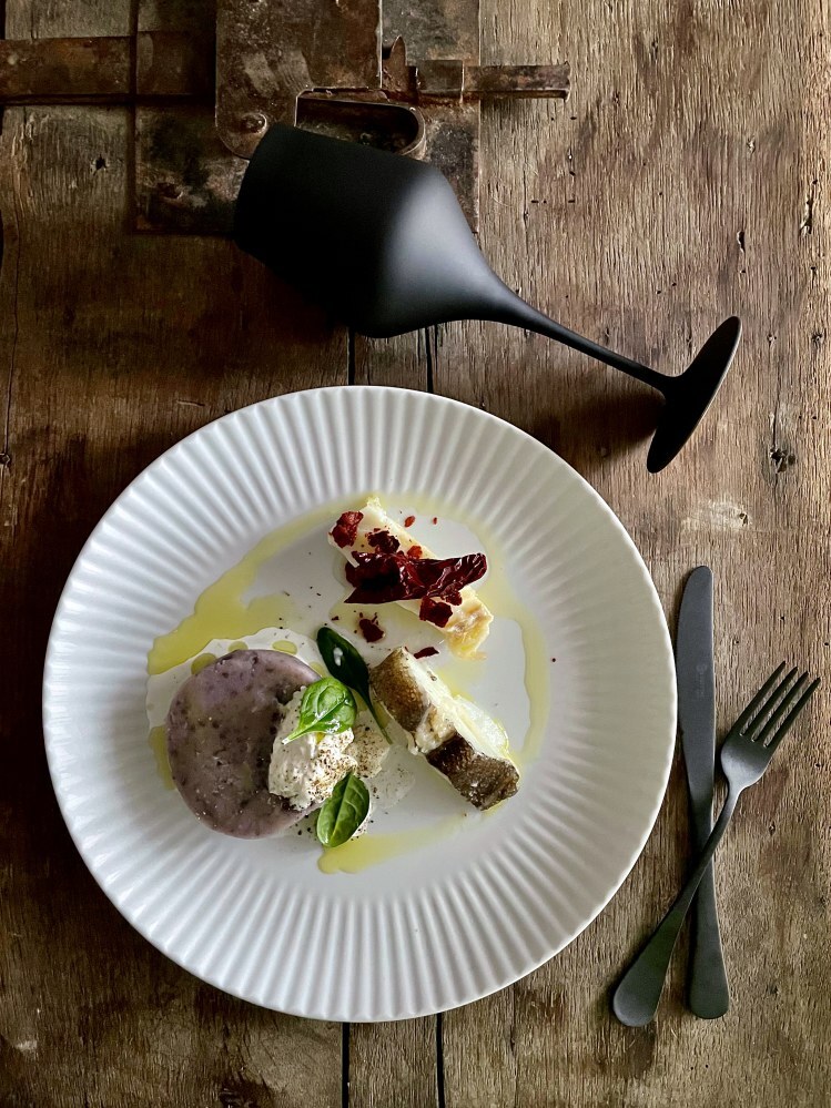 1. Baccalà scottato con patata viola e crusco nel piatto piano Country Chic White.