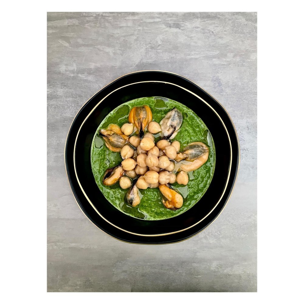 4. Crema di cime di rapa, ceci e cozze nei piatti Onix Black.