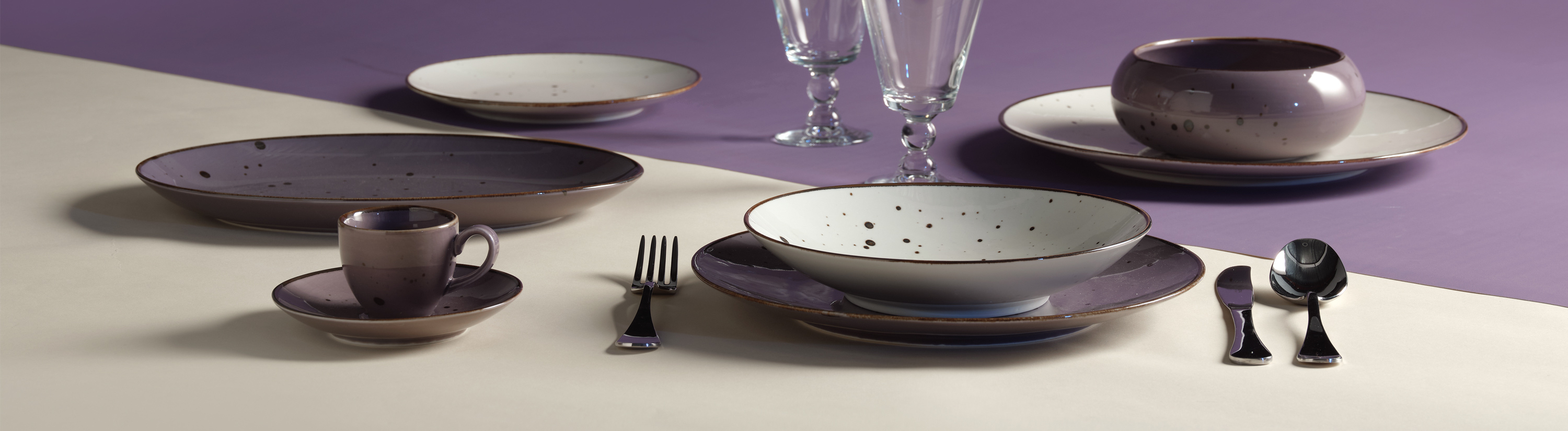 Prova l'abbinamento vincente tra Cottage Violet e Cottage Ivory, mixando piatti e accessori gourmet per mise en place di stile.