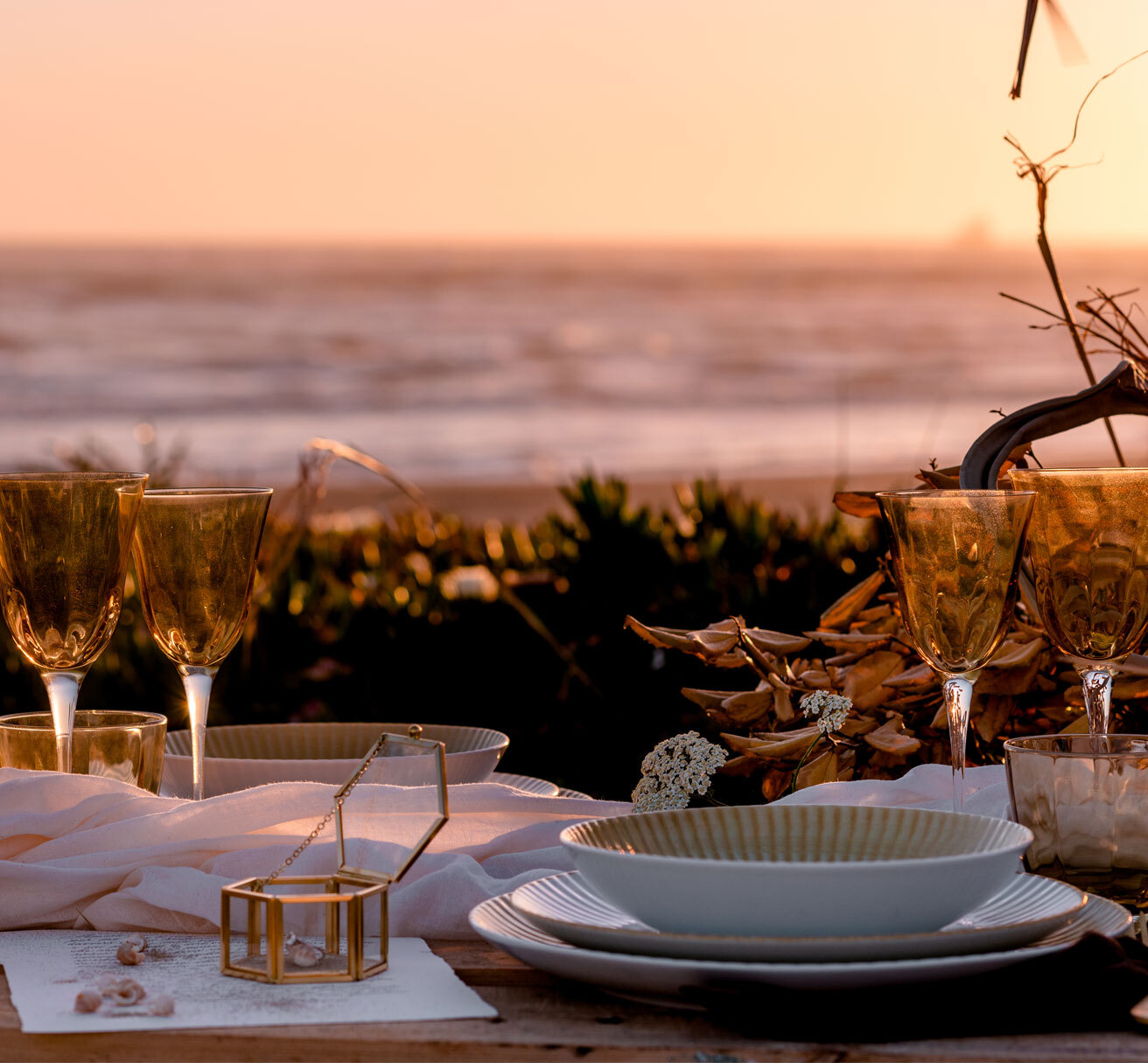 Questa mise en place è dedicata a chi sa cogliere l’essenza delle cose e a chi vuole lasciarsi trasportare in un’atmosfera sospesa nel tempo, nella luce calda e dorata del tramonto, per vivere qui e ora la potenza dell’amore.