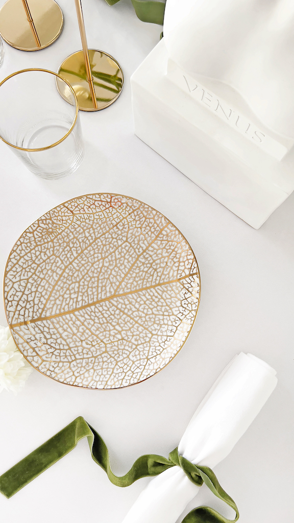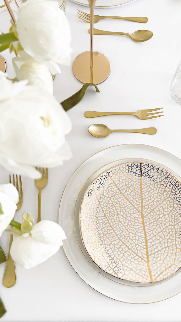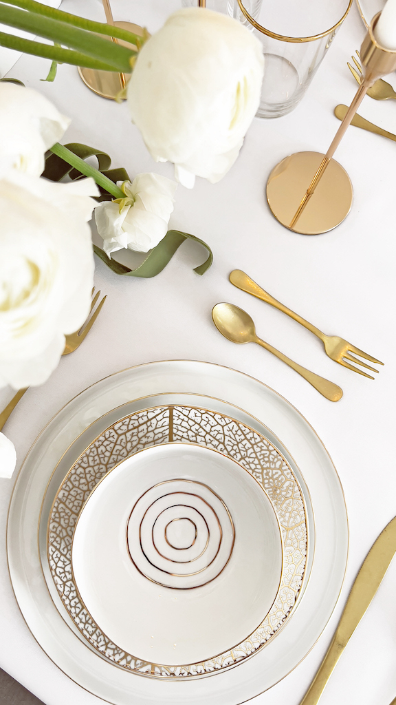 I dettagli in oro 12 kt della linea di piatti vengono ripresi dalle posate e dai bicchieri, che completano e arricchiscono l’allestimento, perfetto per un’occasione importante.