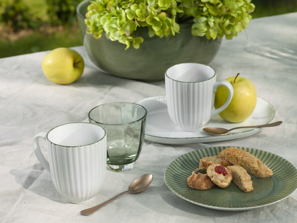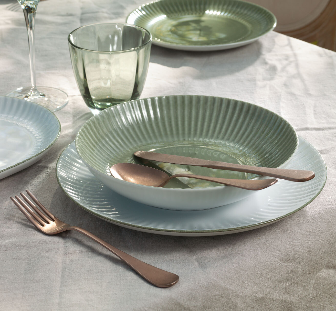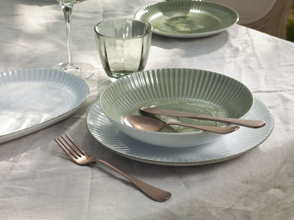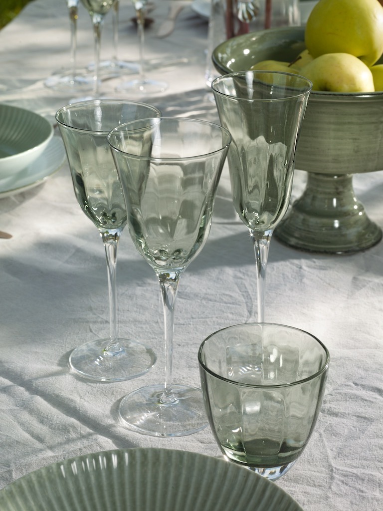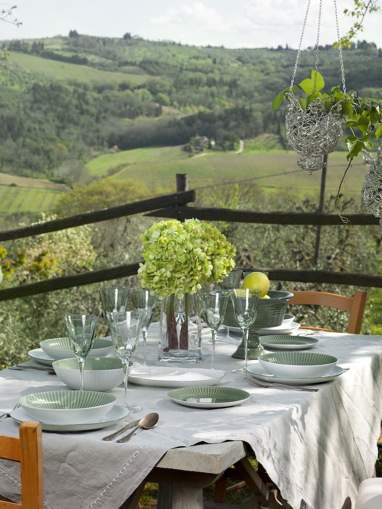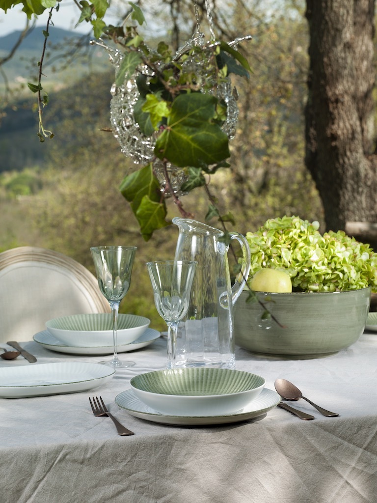 Dalla prima colazione alla cena, scegli l'eleganza del decoro a rilievo della linea Country Chic Salvia. La sua dolce sfumatura verde incontra i calici Tuli Optic Green, per creare ogni giorno tavole originali all'insegna dello stile.