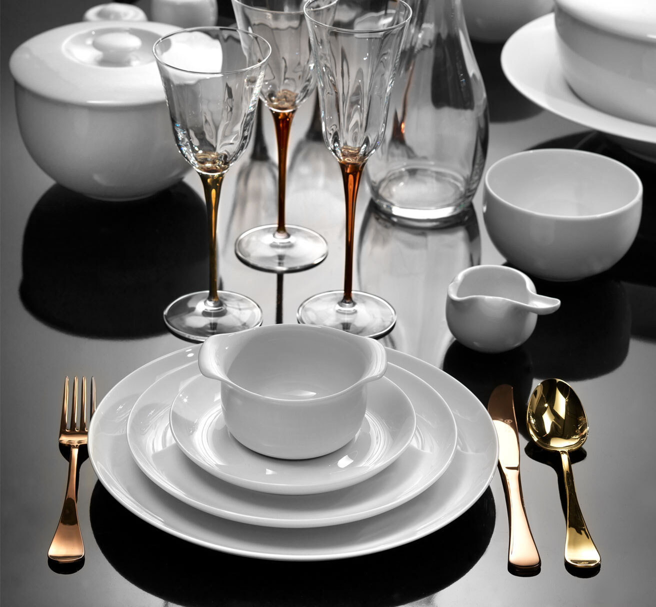 ULTRA WHITE e stile senza tempo. Una linea raffinata che si compone di piatti per la TAVOLA DI OGNI GIORNO e di ACCESSORI DI STILE per una CUCINA DA CHEF, come la salsiera dalla linea inconfondibile, il piattino da carciofo, il vassoio per asparagi e la coppetta avocado. Ogni articolo è essenzialmente perfetto, regolare, privo di porosità e liscio al tatto.