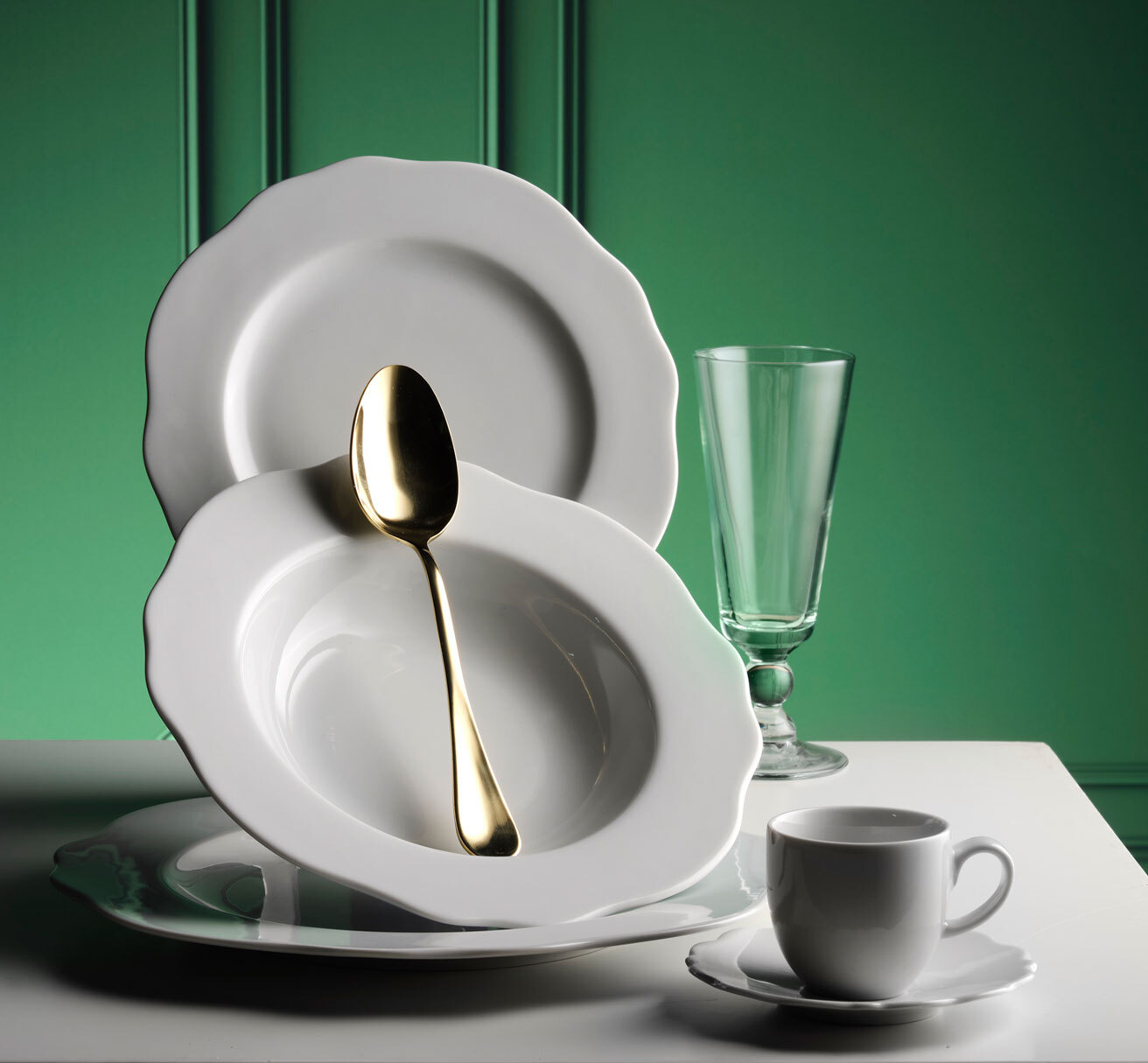 Una linea dalla forma particolare per mise en place raffinate, dall'antipasto al caffè.Â